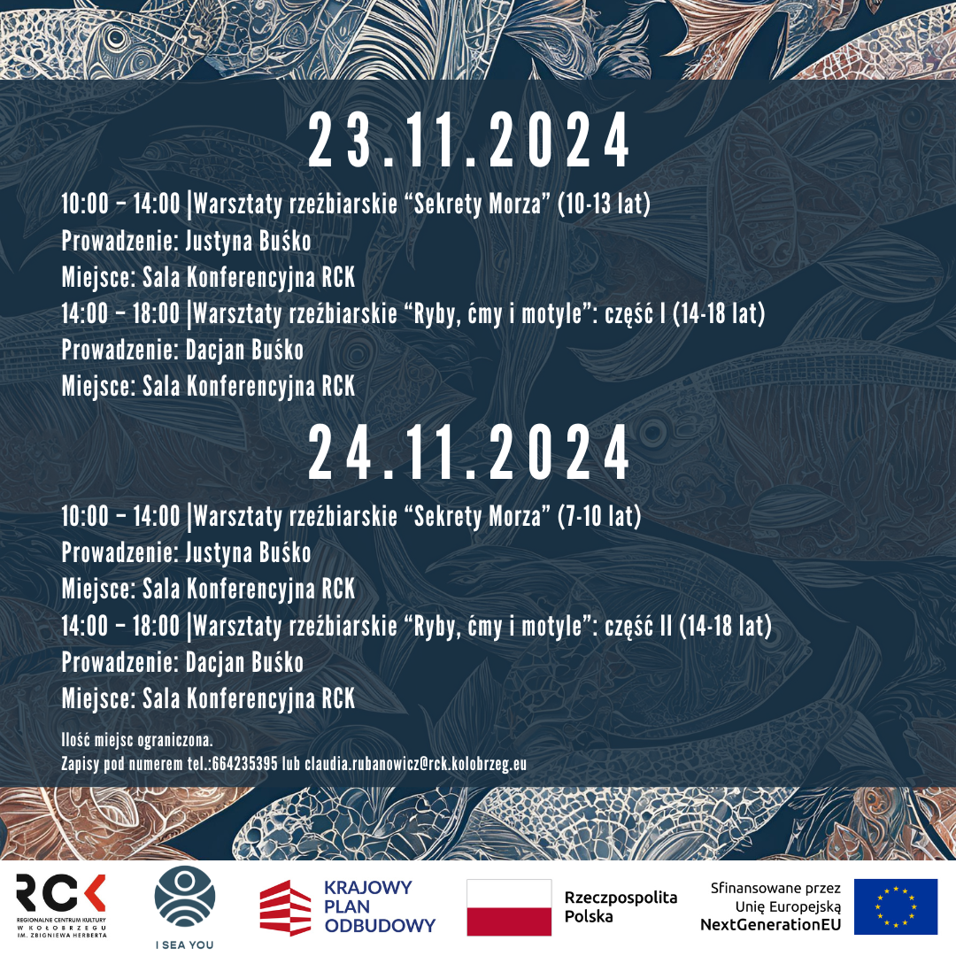 - 14:00 - 18:00 - "Ryby, Ćmy i Motyle" - warsztaty rzeźbiarskie dla młodzieży w wieku 14-18 lat prowadzone przez Dacjana Buśko.