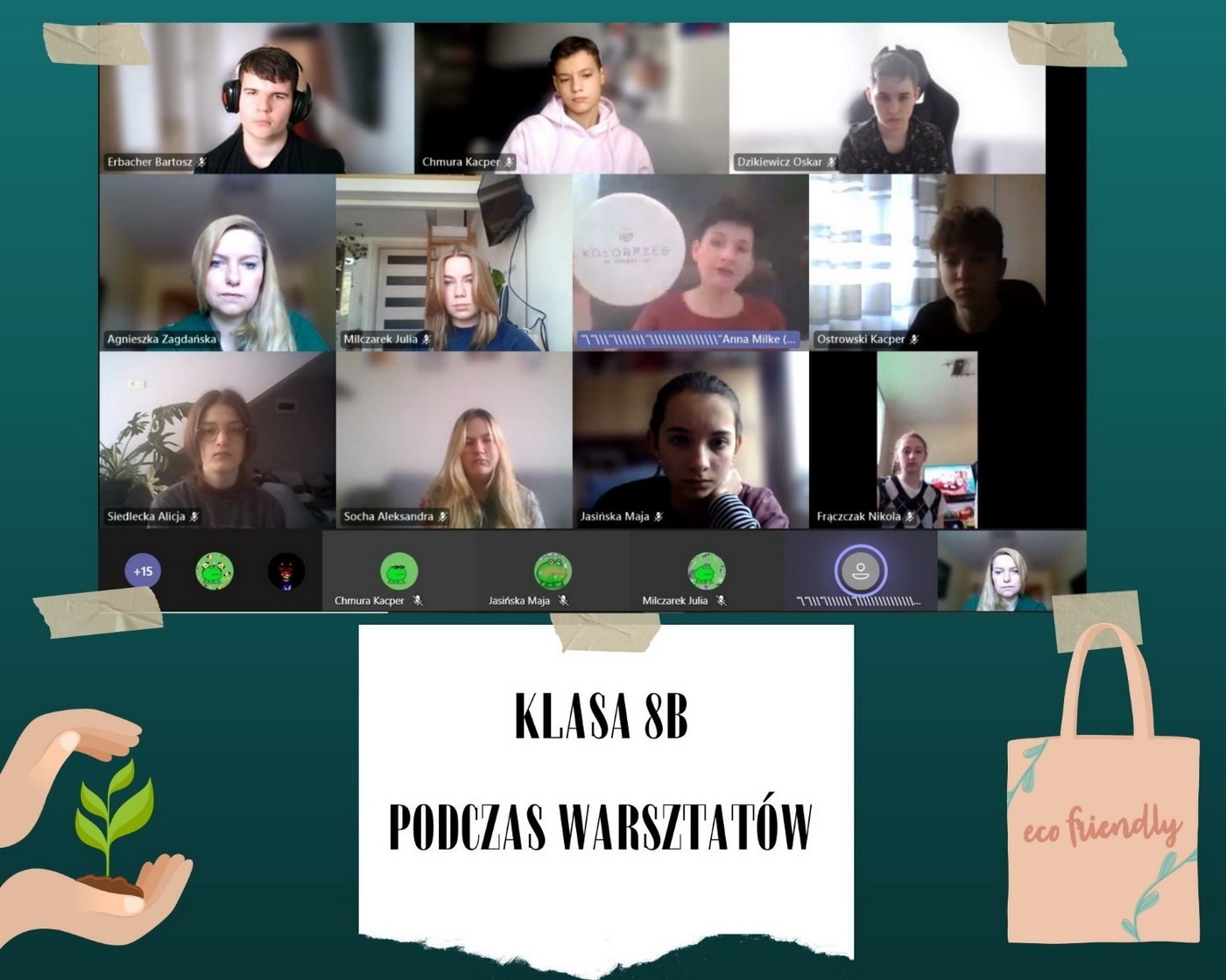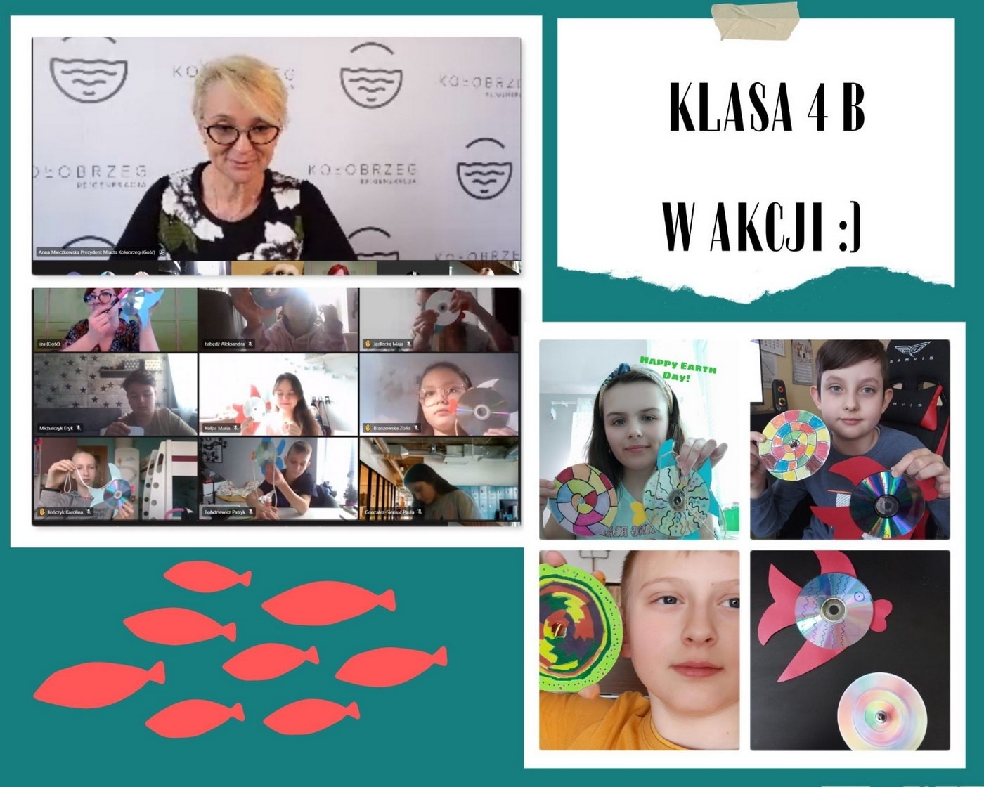 W dniu warsztatów wszyscy mieli przygotowane płyty CD, kolorowe kartki z bloku, sznurek, nożyczki, kredki, klej oraz monetę jednogroszową. Prowadząca zajęcia, pani Izabela Korpa-Jarosz opowiadała o tym, jak dać drugie życie niepotrzebnym już przedmiotom. Jednak oprócz zajęć plastycznych uczniów klasy 4b spotkała spora niespodzianka! Na zdalnych warsztatach ekologicznych pojawił się Gość Specjalny – Prezydent Miasta Kołobrzeg Pani Anna Mieczkowska.