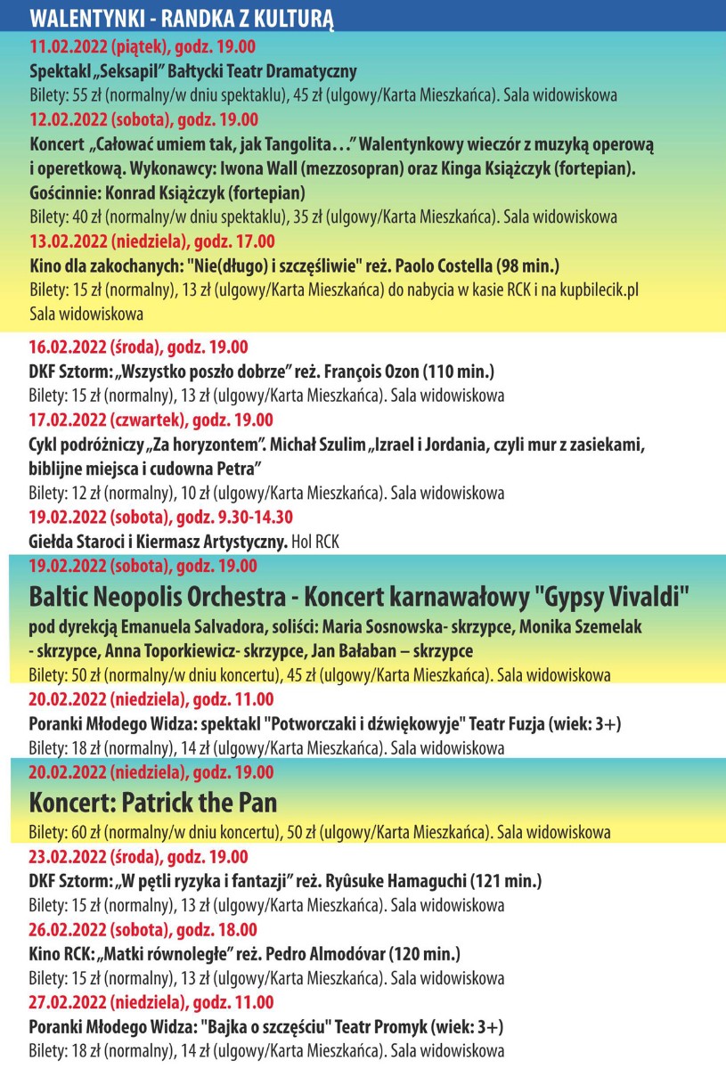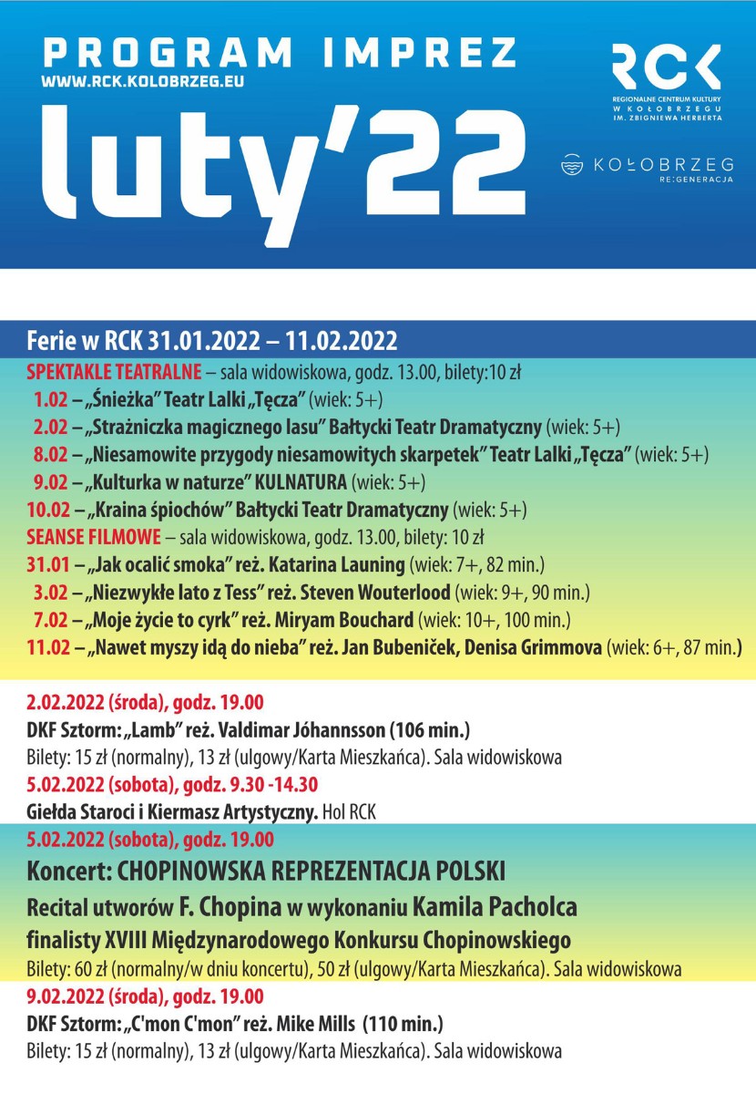 Zapraszamy do zapoznania się z kalendarzem imprez w miesiącu LUTY 2022 r. - między innymi program na Ferie Zimowe, Dyskusyjny Klub Filmowy SZTORM (Lamb, C'mon, C'mon, Wszystko poszło dobrze), spektakle teatralne (Seksapil), koncerty...