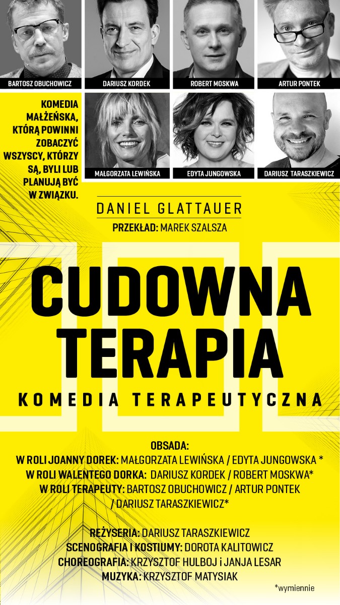 Spektakl zachwyca nie tylko inteligentnym tekstem i dynamiczną reżyserią Dariusza Taraszkiewicza, ale także wybitnymi kreacjami aktorskimi. "Cudowna terapia" to gwarancja wieczoru pełnego śmiechu i refleksji, które pozwolą Ci spojrzeć na własne życie z dystansem i humorem! Zapraszamy do teatru na spotkanie z bohaterami, którzy pokażą, że nawet w najtrudniejszych momentach warto walczyć o miłość. Sprawdź repertuar i zarezerwuj bilety na spektakl "Cudowna terapia"!